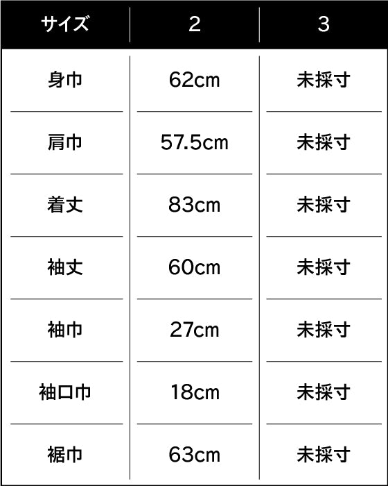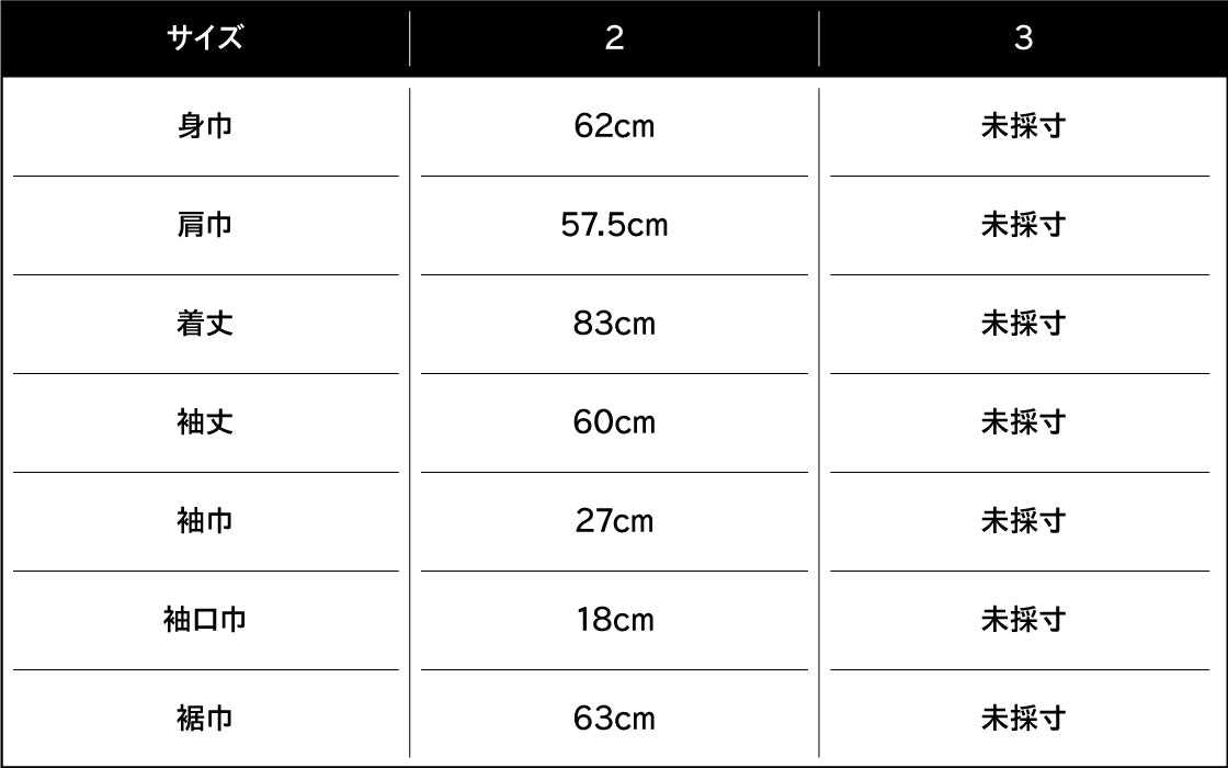 身長182cm、バスト90cm、ウエスト76cm、ヒップ88cm、肩巾53cm、袖丈63cm、頭回り59cm