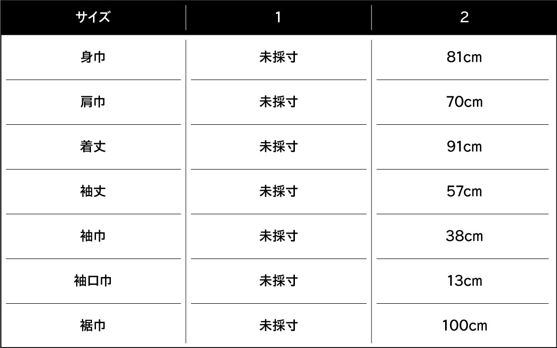 身長182cm、バスト90cm、ウエスト76cm、ヒップ88cm、肩巾53cm、袖丈63cm、頭回り59cm