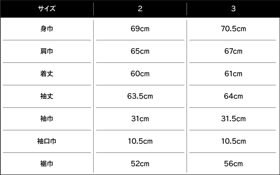 身長182cm、バスト90cm、ウエスト76cm、ヒップ88cm、肩巾53cm、袖丈63cm、頭回り59cm
