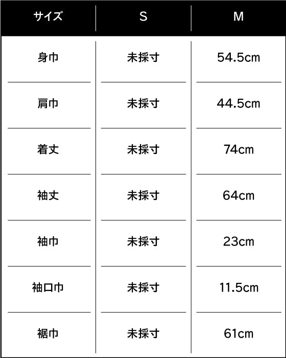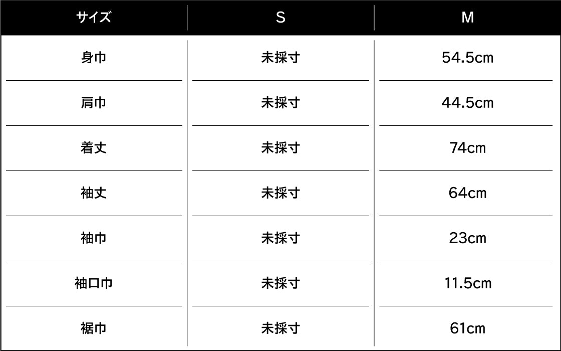 身長182cm、バスト90cm、ウエスト76cm、ヒップ88cm、肩巾53cm、袖丈63cm、頭回り59cm