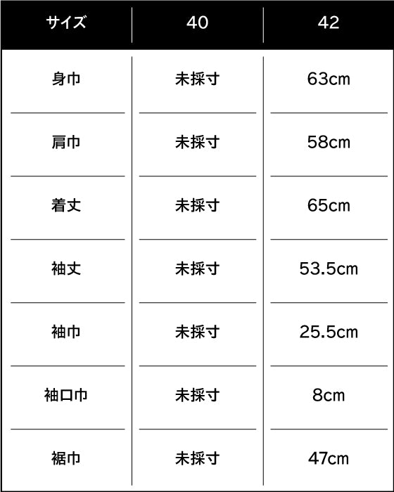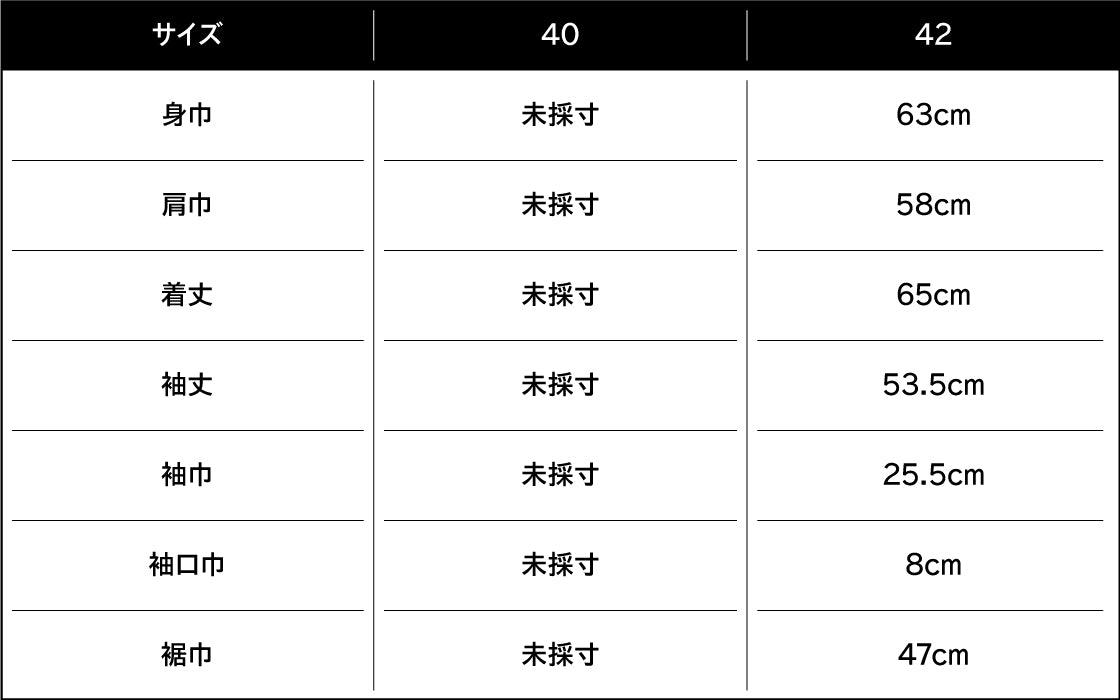 身長182cm、バスト90cm、ウエスト76cm、ヒップ88cm、肩巾53cm、袖丈63cm、頭回り59cm