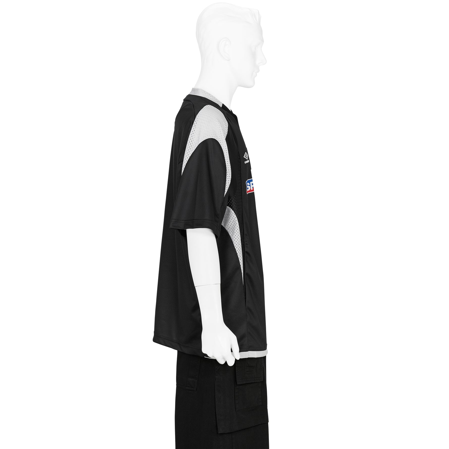 SS25より日本初展開となったSLAM JAMとUMBROによるコラボレートコレクション。AW25コレクションも引き続き、限定された店舗での取扱いとなっております。先ず、SLAM JAMについて簡単にご説明させていただきますと、1989年にルカ・ベニーニ氏によって設立されたイタリアのディストリビューションカンパニーです。また、様々なブランドディレクション事業にも携わっており、例えばニュージェネレーションデザイナーとして注目を集めている_J.L-A.L_もSLAM JAMのハンドリングブランドの一つです。いち早く才能ある若いデザイナーに目を向けて発掘するセンス、そして彼らのビジネスを支援していくスタンスがSLAM JAMが世界中から一目置かれる要因なのだと僕は思います。イタリア内でストリートからハイファッションまで取り揃えているセレクトショップの運営もしており、これまでにも様々なブランドとのコラボレーションワークを実現。中でも本コレクションは今最も注目すべき最新のコラボレーションと言えるでしょう。特にこの英国のフットボール文化に根差したUMBROコレクションは、UKトラディショナルの表れである紋章やチェック柄などをスポーツディテールとミックスし、フーリガンをインスパイア源としたスタイルを個性的に表現。マンチェスターを拠点とするUMBROとUKストリートカルチャー、ひいてはUKユースカルチャーとの関係性を代弁する非常に興味深いコレクションとして買い付けました。リアルな空気感を漂わせるデザイン性が、このコラボの存在価値を深くしていると言っても過言ではありません。尚、本コレクションの一部のデザインは90年代のマンチェスター・ユナイテッドのユニフォームからインスパイアされたデザインが盛り込まれており、このゲームTシャツはそれに該当します。右胸にはクラシカルなUMBROロゴ、そして左胸にはイギリスの国花である薔薇のモチーフを毒々しく表現。スポンサーロゴが入るフロント中央には、1997-98年のマンUユニフォームに入っていた「SHARP VIEWCAM」をもじり、「SPYCAM」と入れています。“ SPY ( 偵察する、見張る ) ”と “ CAMERA ( カメラ ) ” を掛け合わせた造語ですが、敵チームを隠密に監視する行為を表したワードとの事。リアリティーのあるユーモアセンスも感じさせるデザインに仕上がっていますね。