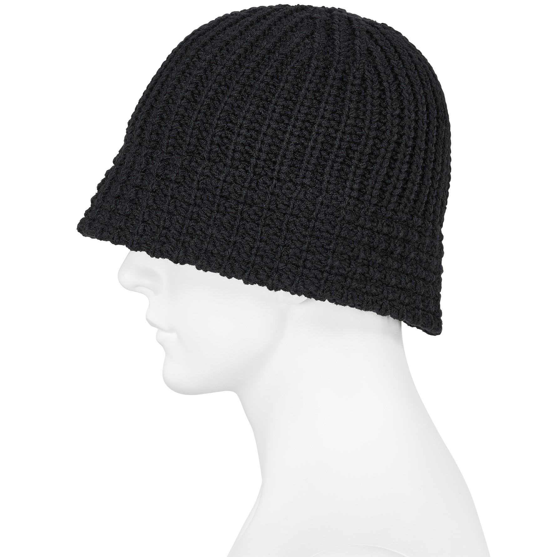 AW25シーズンのYohji Yamamoto POUR HOMMEは、ニットのバリエーションが非常に豊富で様々なデザインのニットを買い付けてきております。パリで行われたショーでは、寒さを凌ぐ為に必要な温かさは、単に機能性を帯びた洋服の物理的な温かさのみならず、人との繋がりによって生まれる心の温もりも大切にしたいという想いが伝わってくるようなメッセージを感じました。そのような流れから今シーズンは「温かい」という意味を込めてニットアイテムを充実させているのではないかと思っています。本アイテムは、ウール70%とアクリル30%を混紡した糸を用いて製作されたニットハットです。バケットハットを想定して編み立てており、ニットキャップとはまた異なる個性を感じます。クラウンは畦編みで形成しつつ、ブリム部分は編み柄を変えると同時にステッチを施し、へにゃっと崩れないよう張り感を出した作りとしています。ブリムが広がらないコンパクトなシルエットなので、あまり大袈裟な感じがなく、個人的には被りやすいデザインのハットだと思います。冬のスタイルに合わせるニット小物として是非ご検討ください。
