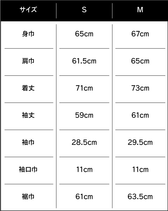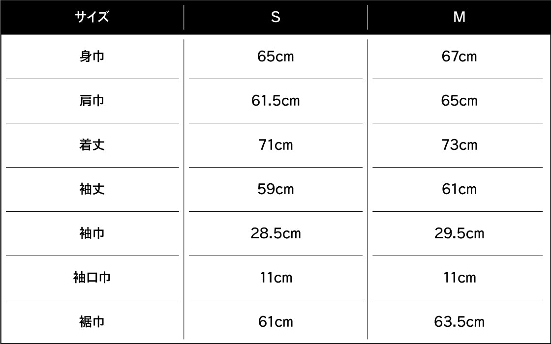 身長182cm、バスト90cm、ウエスト76cm、ヒップ88cm、肩巾53cm、袖丈63cm、頭回り59cm