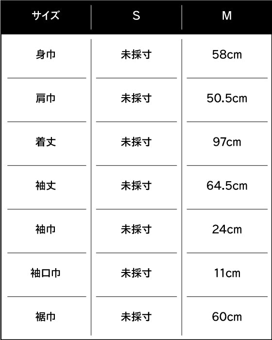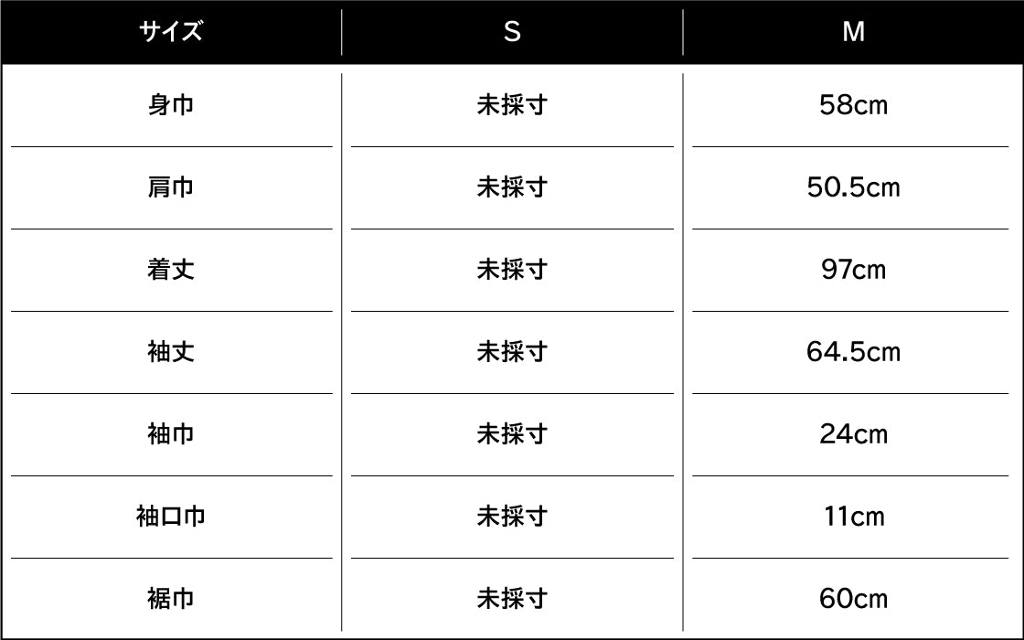 身長182cm、バスト90cm、ウエスト76cm、ヒップ88cm、肩巾53cm、袖丈63cm、頭回り59cm