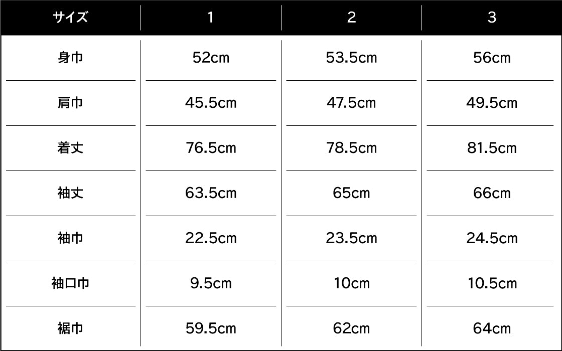 身長182cm、バスト90cm、ウエスト76cm、ヒップ88cm、肩巾53cm、袖丈63cm
