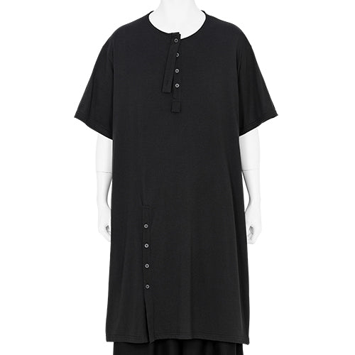 2025年春夏のコレクションにてLOOK No.35で使用されていた本アイテム。今シーズンは、昨今の様々な世界情勢を危惧し、精神面における静寂を求めて仏教に回帰した内容としています。仏教史に関連する僧侶や詩人の言葉や仏法に至るまで、デザイナー山本耀司氏がインスパイアされた色々なワードが表現方法として用いられています。「顕るるものと隠るるものと」。この言葉は、慈円 ( 1155~1225 ) が歴史の道理を読み解こうとした「愚管抄」にある一節です。“ 物ごとの背後には、目に見えない冥の道と目で見ることのできる顕の道という二つの筋道があり、また邪神と善神の御争いというものがあって、それらが表にあらわれたり、内にこもったりしているのが明確にわかってくる ” 現代における政治や社会情勢にまで通じる深い意味が感じられるようですね。右袖には仏教の重要な真理を示す四法印も添えています。また、今回のコレクションの中からセレクトしたこのTシャツは、これらの意味深き言葉と共に耀司氏が描いたデッサン画がポイントにもなっています。本作で使用しているボディーは、ゆったりとしたシルエット感とヒップが隠れるほどの長めの着丈感を特徴としたオーバーサイズのTシャツです。尚、このカットソー地には表面の不要な繊維を除去するコーミング加工が施されたコーマ糸を使用。より繊維が均一になり、毛羽立ちにくく、生地の表面が綺麗に仕上がっています。適度な張り感と上品さがポイントの天竺編みの生地とも言えますね。風により揺れ、生地のしなやかさが感じられるようなパターンメイキングにもなっており、同ブランドの個性が十分に表現されているTシャツに仕上がっていると思います。