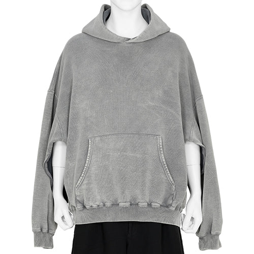 ●前身頃の裾から約20cmの位置にコンシールファスナーを施しています。通常着用は勿論、ZIPを開けた箇所から体を入れ着用する事によって前後で着丈の異なる個性的なアイテムとしてもお召しいただけます。