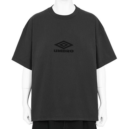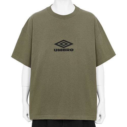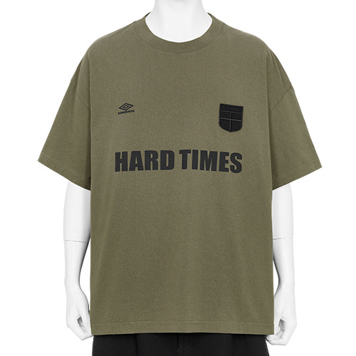 SS24よりスタートしたSLAM JAMとUMBROによるコラボレートコレクション。3シーズン目となるSS25コレクションは日本国内におけるセレクトショップでは初展開となり、限定された店舗での取扱いとなっております。先ず、SLAM JAMについて簡単にご説明させていただきますと、1989年にルカ・ベニーニ氏によって設立されたイタリアのディストリビューションカンパニーです。また、様々なブランドディレクション事業にも携わっており、例えばニュージェネレーションデザイナーとして注目を集めている_J.L-A.L_もSLAM JAMのハンドリングブランドの一つです。いち早く才能ある若いデザイナーに目を向けて発掘するセンス、そして彼らのビジネスを支援していくスタンスがSLAM JAMが世界中から一目置かれる要因なのだと僕は思います。イタリア内でストリートからハイファッションまで取り揃えているセレクトショップの運営もしており、これまでにも様々なブランドとのコラボレーションワークを実現。中でも本コレクションは今最も注目すべき最新のコラボレーションと言えるでしょう。特にこの英国のフットボール文化に根差したUMBROコレクションは、UKトラディショナルの表れである紋章やチェック柄などをスポーツディテールとミックスし、フーリガンをインスパイア源としたスタイルを個性的に表現。マンチェスターを拠点とするUMBROとUKストリートカルチャー、ひいてはUKユースカルチャーとの関係性を代弁する非常に興味深いコレクションとして買い付けました。リアルな空気感を漂わせるデザイン性が、このコラボの存在価値を深くしていると言っても過言ではありません。本アイテムはコットン100%のカットソー地を用いたオーバーサイズのTシャツです。このデザインはゲームシャツに見立て、右胸には90年代に使用されていたUMBROの旧ロゴ、そして左胸にはイングランドの国旗を象徴する十字を象ったエンブレムを施しています。またフロントには本コラボのモットーである " HARD TIMES " の文字をスポンサーロゴのように配置。1924に創設されたUMBROブランドは2024年で100周年を迎えました。その100年の道のりを一言で表現した言葉が “ HARD TIMES ( 苦難 ) ” です。またピッチ上で試合をする選手たち、応援するサポーター、スタジアムを警備するセキュリティーマン、それぞれのストーリーにおける苦難も表しているとの事。ボディーはフェード加工したウォッシュブラックとオリーブグリーンの2色展開となっています。