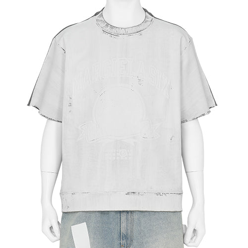 マルタン・マルジェラのMM6よりSS25シーズンの新作が入荷致しました。これまでMM6は女性のためのベーシックラインというカテゴリーとして存在していましたが、AW22シーズンよりメンズアイテムを少しずつコレクションに加えるようになり、現在ではコレクションの約3〜4割をメンズが占めるほどになっています。同ブランドはミラノコレクションにてショー形式でランウェイを行なっており、メンズとレディースを織り交ぜた内容でコレクションを発表。尚、MM6の現デザイナーは、VYNER ARTICLESという自身のブランドを手掛けているHeikki Salonen ( ヘイキ・サロネン ) が担当しています。VYNER ARTICLESはELIMINATORで以前に取り扱っていたブランドであり、デザイナーが持つ精神性との整合性も良いと判断し、セレクトブランドにMM6を加えています。今シーズンのMM6では、マルタン・マルジェラ氏のデザインフィロソフィーに改めてフォーカスしている様々なアイテムがリリースされています。本アイテムにおいては、カレッジロゴ風のフォントによるブランド名とカレンダーロゴがフロントに施されていますが、敢えて白色のボディーに対して白色のプリントを乗せている点がポイントですね。これもまた、マルタン本人のデザイン哲学にあった匿名性を重んじた表現なのだと思います。具体的には、「大学名=ブランドバリュー」という思想が根付いてしまっている世の中に対してのアンチテーゼとも言えるのではないでしょうか。この価値観はファッションのブランド概念にも同じ事が言えますね。尚、袖はカットオフしたような裁ち切り仕様のノースリーブに。また、メッシュ素材のフードもデザインポイントとなっています。