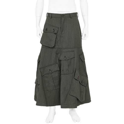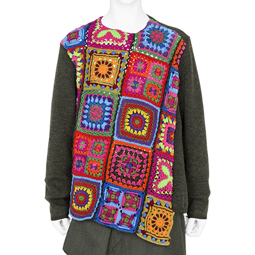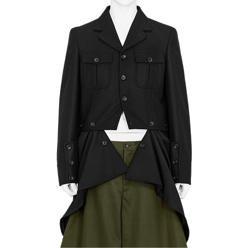 ELIMINATORのベーシックなバイイングコンセプトは英国的であることです。しかしその根本にあるのは、英国人的な発想とファッションを単純なスタイルとしてではなく信念の一つとして捉えるスタンスです。COMME des GARÇONSはアート性の高い洋服であると同時に常に新しい価値観を模索し続け、アンチな精神をベースにイデオロギーに負けない自分自身を形成する為の挑戦を、ファッションを通して表現している点に共感し買い付けしております。それはまさに英国人的な精神に通ずるものがあると確信しています。COMME des GARÇONSブランドには複数のレーベルが存在しますが、当店にて扱わせていただいている " COMME des GARÇONS HOMME PLUS " はデザイナー兼、代表取締役でもある川久保玲氏が自ら手掛けるトップレンジ。卸先は国内でも数店舗しか許されていない貴重なコレクションとなっております。AW25シーズンのテーマは「TO HELL WITH WAR」。様々なミリタリーウエアを壊し、解体し、戦争に対するアンチテーゼを表現。不安定な世界情勢によって巻き起こる戦争への否定的な想いを創作に落とし込み、洋服を通してメッセージを投げかけています。パリで行われたショーでは、全編に渡りミリタリーのユニフォームを解体しテーラードジャケットとして再構築したルックで表現され、非常に評価も高かったとの事。また、リアルなアーミーヘルメットに平和を象徴とする花を装飾したヘッドピースをスタイリングに使用する事で、戦争のイメージと対比させる前向きなメッセージも組み込まれております。本アイテムは、ショーLOOK No.21で使用されていたベストの柄違いバージョンです。作りとしてはミリタリーベストと、花柄の刺繍が施されたクラシックなベストの2着が後身頃を割って縫い付けられて1着として完成させており、右袖から通して一周ぐるっと身体に巻き付けるように着用する個性的な着方が非常に斬新ですね。花柄刺繍の生地には気品があり、無骨なミリタリーとのコントラストが素敵な一着に仕上がっています。アシンメトリーな見え方と共に独特なレイヤースタイルとなる本アイテムは、同ブランドならではの新しい提案が感じられつつ、今シーズンのテーマを象徴したアイテムとも言えるでしょう。