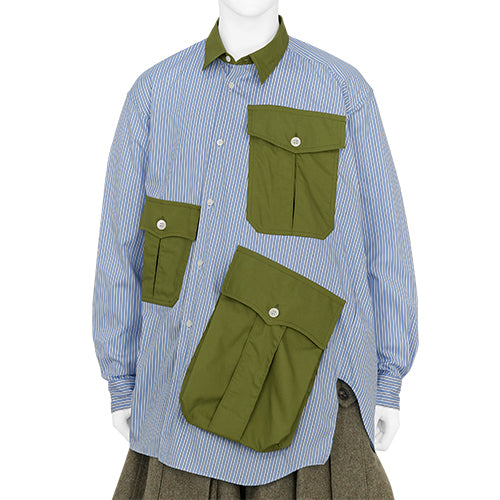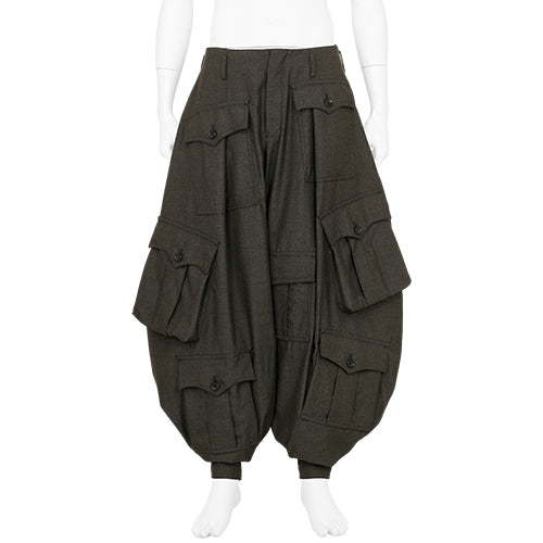 ELIMINATORのベーシックなバイイングコンセプトは英国的であることです。しかしその根本にあるのは、英国人的な発想とファッションを単純なスタイルとしてではなく信念の一つとして捉えるスタンスです。COMME des GARÇONSはアート性の高い洋服であると同時に常に新しい価値観を模索し続け、アンチな精神をベースにイデオロギーに負けない自分自身を形成する為の挑戦を、ファッションを通して表現している点に共感し買い付けしております。それはまさに英国人的な精神に通ずるものがあると確信しています。COMME des GARÇONSブランドには複数のレーベルが存在しますが、当店にて扱わせていただいている " COMME des GARÇONS HOMME PLUS " はデザイナー兼、代表取締役でもある川久保玲氏が自ら手掛けるトップレンジ。卸先は国内でも数店舗しか許されていない貴重なコレクションとなっております。AW25シーズンのテーマは「TO HELL WITH WAR」。様々なミリタリーウエアを壊し、解体し、戦争に対するアンチテーゼを表現。不安定な世界情勢によって巻き起こる戦争への否定的な想いを創作に落とし込み、洋服を通してメッセージを投げかけています。パリで行われたショーでは、全編に渡りミリタリーのユニフォームを解体しテーラードジャケットとして再構築したルックで表現され、非常に評価も高かったとの事。また、リアルなアーミーヘルメットに平和を象徴とする花を装飾したヘッドピースをスタイリングに使用する事で、戦争のイメージと対比させる前向きなメッセージも組み込まれております。本アイテムは、ショーLOOK No.22で使用されたワイドショーツです。ミリタリーディテールを象徴する様々な形状の大きなカーゴポケットがランダムに施されており、とても迫力のあるデザインに仕上がっていますね。素材はヨーロッパのミリタリーウエアで実際に使用されているようなウールとナイロンの混紡生地を用い、その質感と色味がリアリティを感じさせながらも、ギャルソンらしい大胆なアイディアによってファッションに落とし込んでいます。ショーツから思い切り飛び出させるほどに極端に大きいポケットがデザインポイントとなっており、とても個性的に映りますね。デフォルメさせたポケットディテールはミリタリー感を強調すると同時に、コレクションのメッセージを注目させる強いデザイン性を感じる事ができます。
